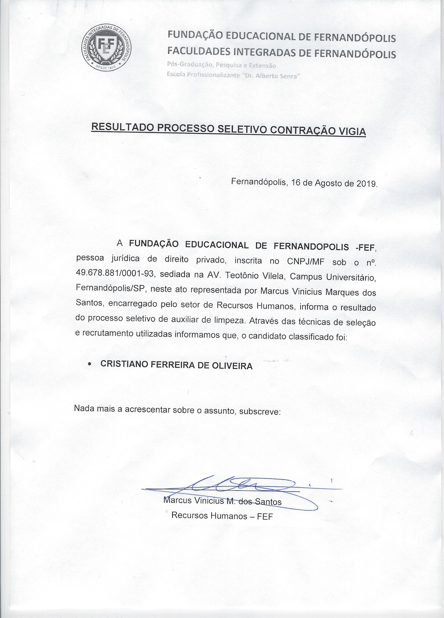 RESULTADO EDITAL 02/2019 - PROCESSO SELETIVO PARA FUNÇÃO DE VIGIA
