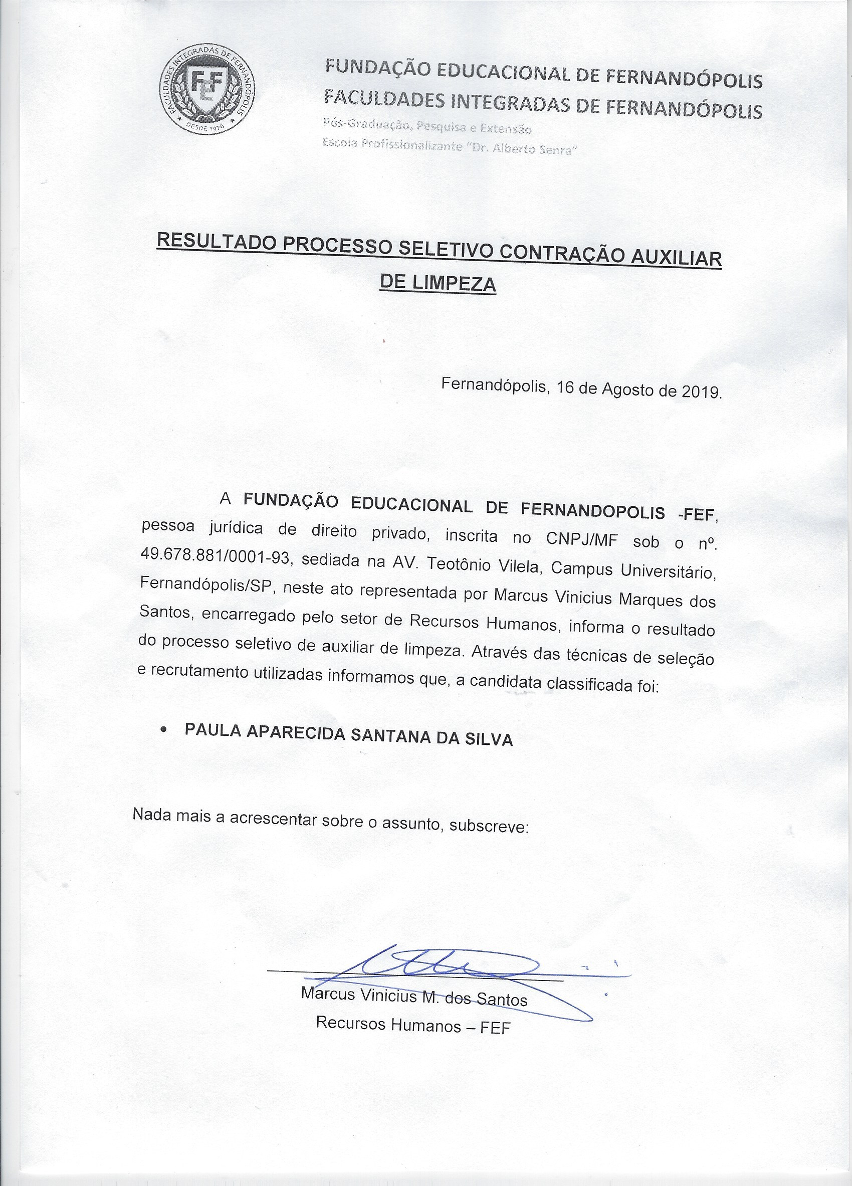 RESULTADO EDITAL 02/2019 - PROCESSO SELETIVO PARA FUNÇÃO DE AUXILIAR DE LIMPEZA