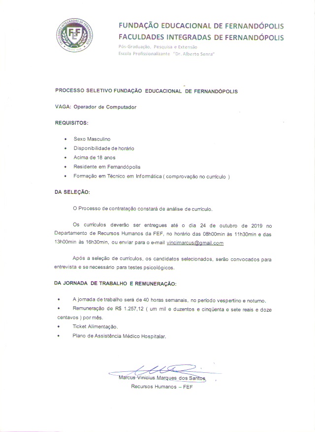 EDITAL 03/2019 - PROCESSO SELETIVO PARA FUNÇÃO DE OPERADOR DE COMPUTADOR