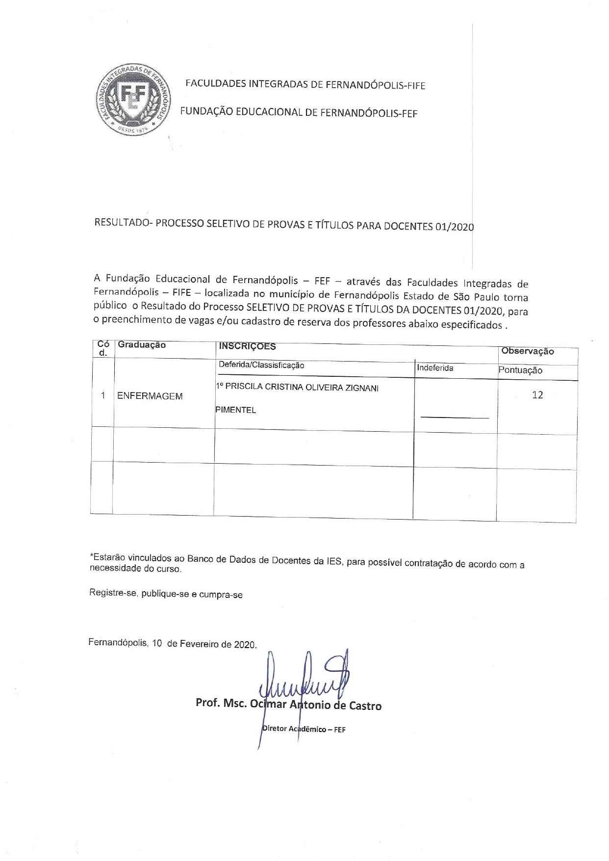 RESULTADO DO EDITAL 01/2020 - PROCESSO SELETIVO DE PROVAS E TÍTULOS PARA DOCENTES - ENFERMAGEM