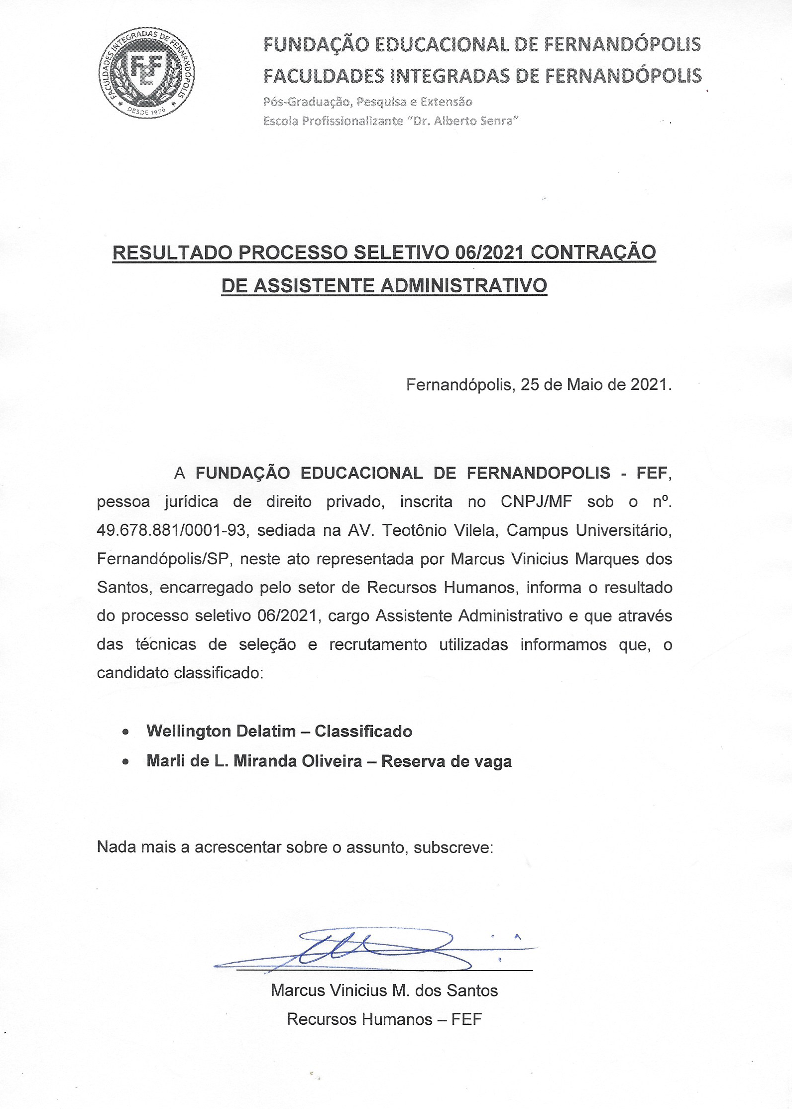 RESULTADO - EDITAL 06/2021 - PROCESSO SELETIVO PARA FUNÇÃO DE ASSISTENTE ADMINISTRATIVO