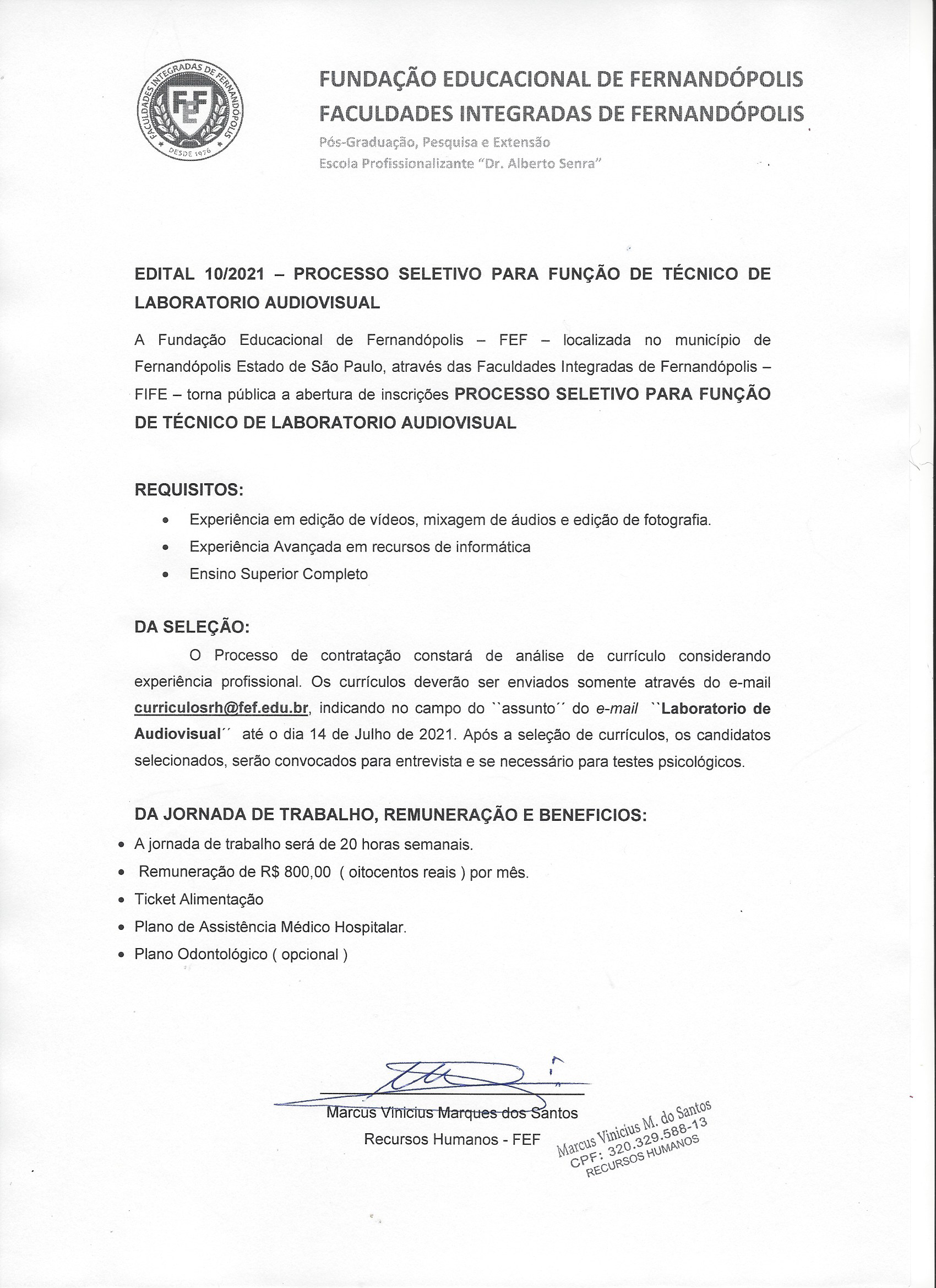 EDITAL 10/2021 - PROCESSO SELETIVO PARA FUNÇÃO DE TÉCNICO DE LABORATÓRIO AUDIOVISUAL