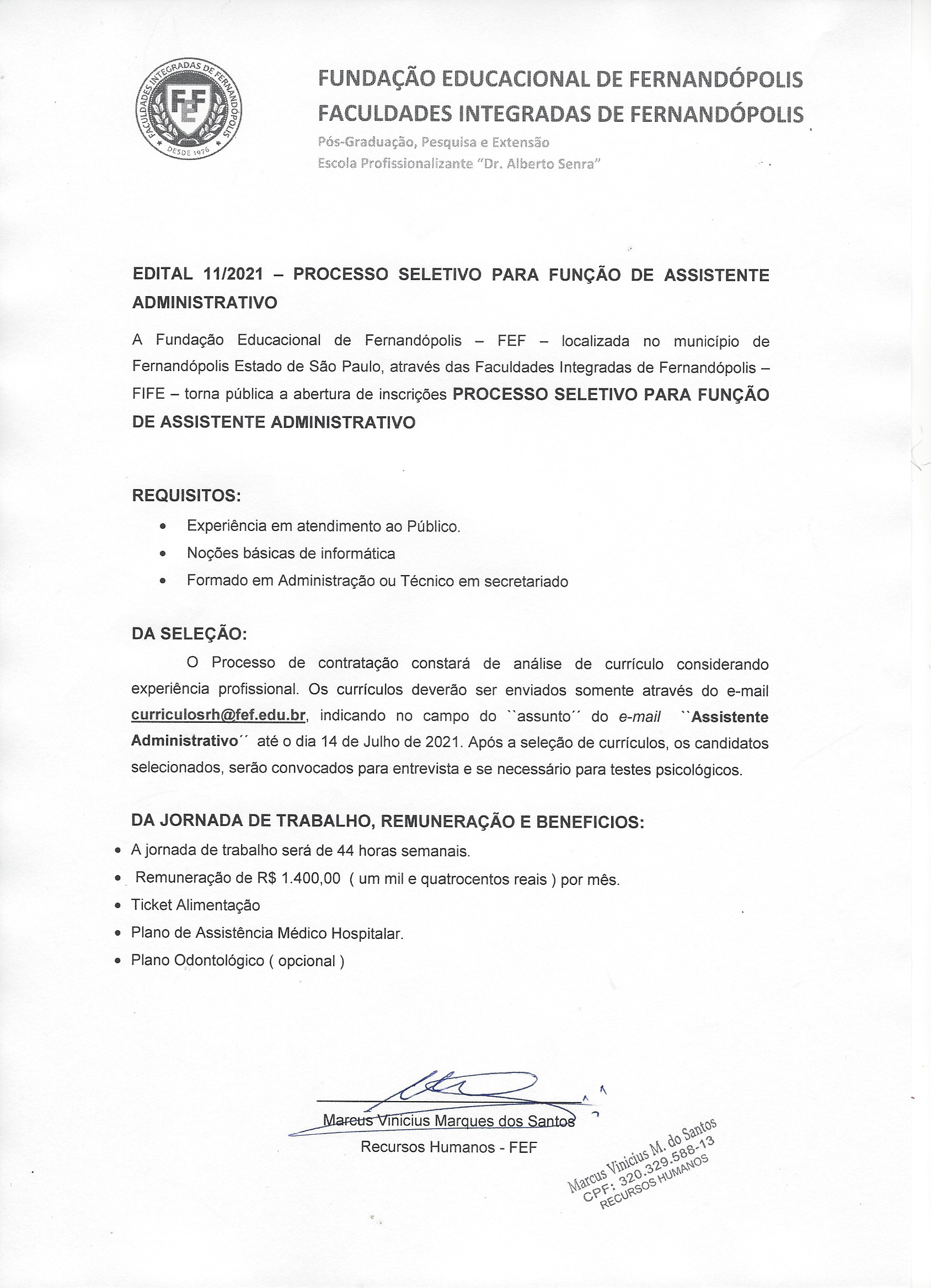 EDITAL 11/2021 - PROCESSO SELETIVO PARA FUNÇÃO DE ASSISTENTE ADMINISTRATIVO